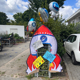 Und so wie wir es gewohnt sind, haben sich unsere Kolleginnen und Kollegen wieder ganz tolle Aktionen, passend zu dem Motto überlegt. Beispielsweise wurde weit im Vorfeld gemeinsam mit den Kindern angefangen eine Fotoraumstation zu basteln. Passend dazu gab es natürlich auch selbst hergestellte Astronauten Helme und ein Wurfspiel mit Weltraumsteinen.